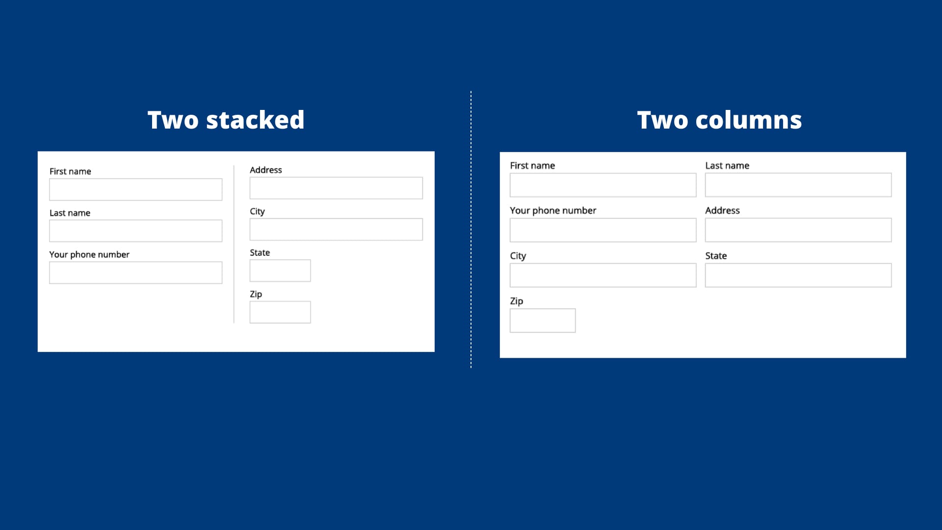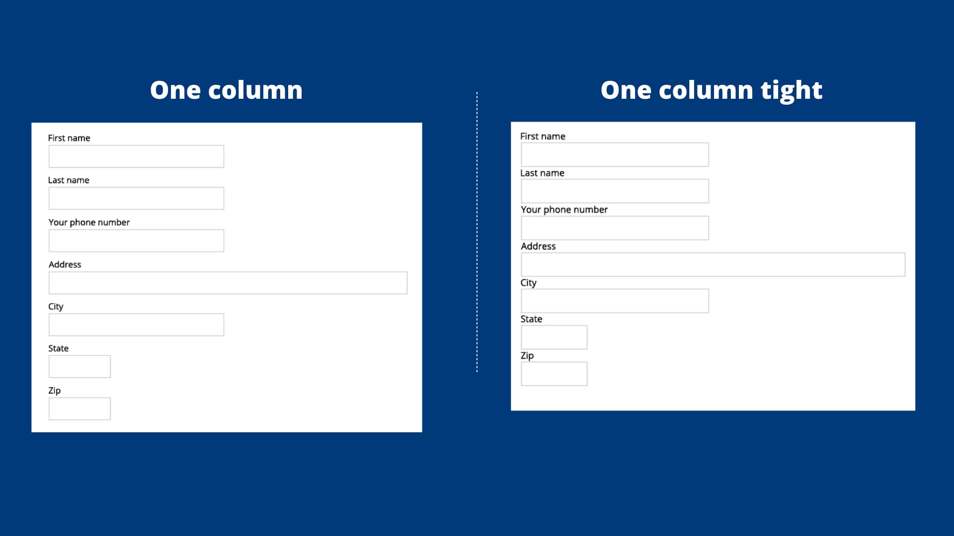 - One column: Form was in a one column layout. Labels on top.