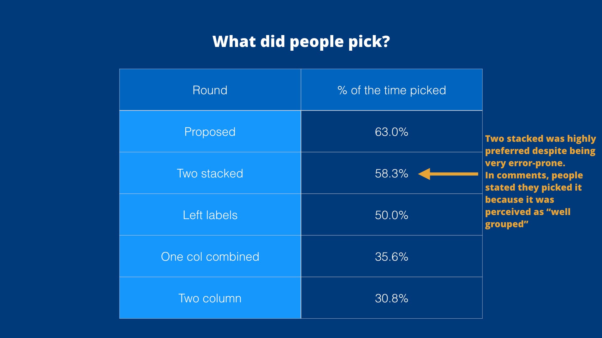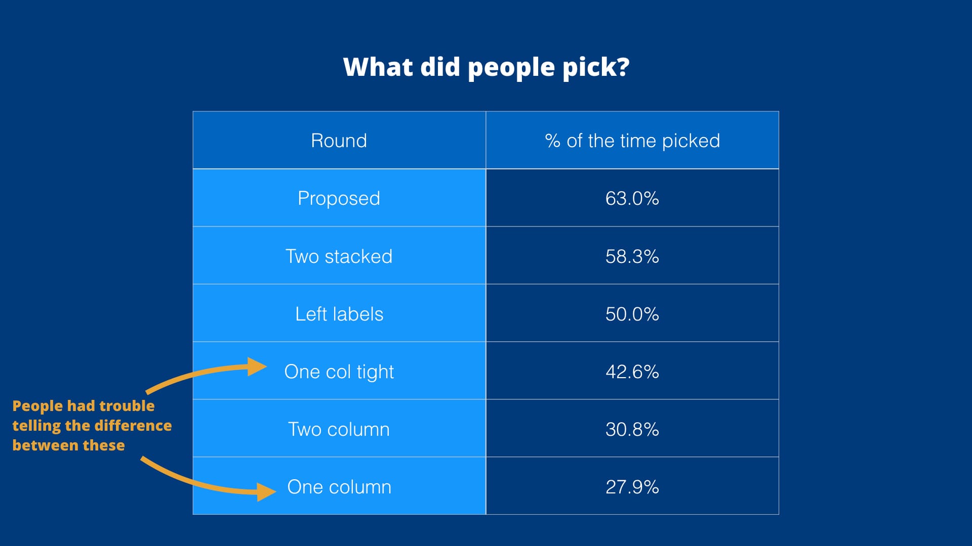 Apart from time, we also collected participant's stated preference for form type. After reading through all the comments, it was clear that most people treated "One column" and "One column tight" interchangeably.