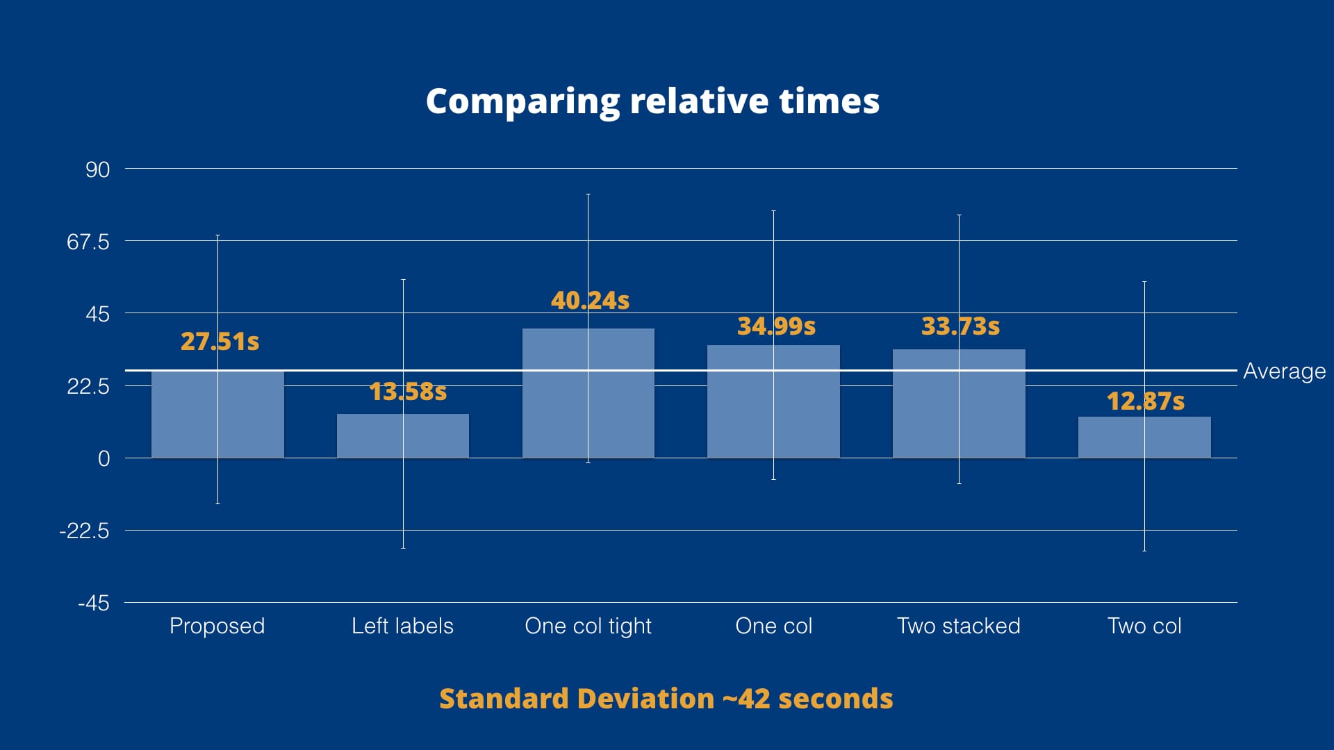 To simulate familiarity, each participant filled in the form three times. The first as a practice, and the second two were random conditions. The time from the third form fill was used to examine. "Left labels" and "2 columns" were found to be statistically slower than the others. "Two stacked" was not statistically slower, but was error prone. There was no statistical difference between the one column variations.[/vc_column_text][/vc_column_inner][/vc_row_inner][/vc_column][/vc_row][vc_row thb_divider_position="bottom"][vc_column][vc_column_text]