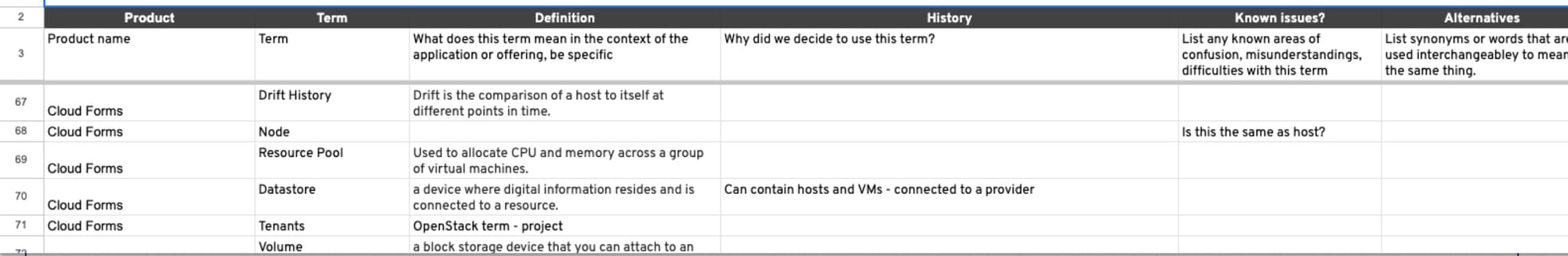 Having a glossary of terms for a product can help immensely in having clear and precise language in documentation; and it also assists product teams in making sure they are not overloading terms or using incorrect language to describe features or interactions. Creating a glossary together is a great way of getting this in place quickly with effective knowledge sharing.